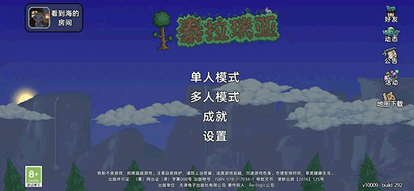 3.进入泰拉瑞亚游戏后,主菜单上会显示单人游戏和多人游戏两个可选项。。多人模式说白了就是你跟别的玩家在同一张地图里玩,一起探险。听着不错,但这也意味着地图上有限的资源你们得一块分,怪也得一起扛。对于一个刚上手的新人来说,连道具怎么4用、新东西怎么合成都得现学,要是跟一群老油条一起玩,实力差距太大,你的游戏体验基本为零,全程当老板看戏。所以在单人模式下,自己慢慢摸索,学习效率会高很多,我们强烈推荐你用单人模式开启你的第一次泰拉瑞亚之旅。