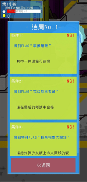 这些就是真结局需要的所有flag了,但你不需要全部集齐,只要达到游戏要求的数量就行。具体差几个,随时可以打开结局提示界面看,这样目标就明确多了。要是行动点不够,或者想SL,看看广告是个不错的选择。UI稍微有点复古,广告有时候弹出来也确实有点烦,但考虑到能白嫖,人家开发组也要恰饭嘛,咱们玩家最不缺的就是时间。当你把所有条件都满足之后,最后一天会出现一个究极选项:“一切妨碍二人的事物”,别犹豫,选它就对了。