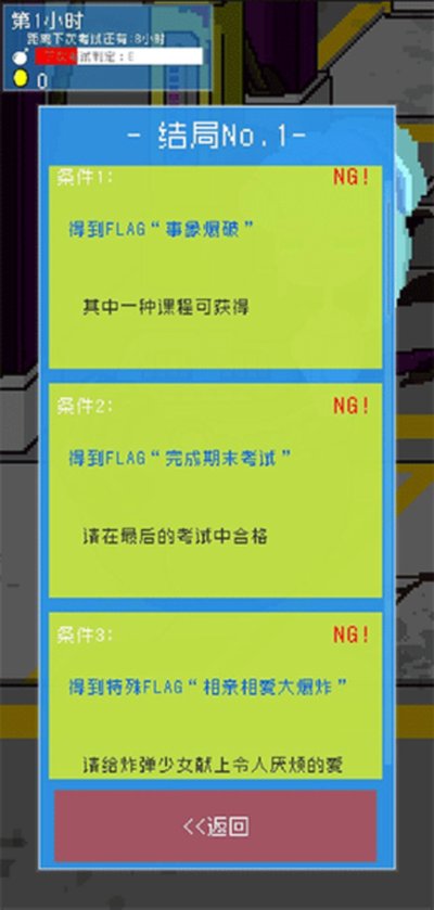 这个叫“事象爆破”的技能,你得去“炸弹-cbu-事象爆破”这个路径里学。根据我个人的实测经验,你得先把前置的“限定爆破”给学完了,它才会冒出来。至于“完成期末考试”,意思很直白,就是你得老老实实上完99节课,别手贱中途把她给投放了。而“相亲相爱大爆炸”这个flag,需要集齐三个特殊的flag才能自动拿到。说白了,就是无脑追她,当个纯情舔狗。炸弹力什么的,只要能保证考试及格就行,多余的行动点全部用来提升好感度,跟她表白,说要娶她,跟她定下一大堆约定,懂了吧?