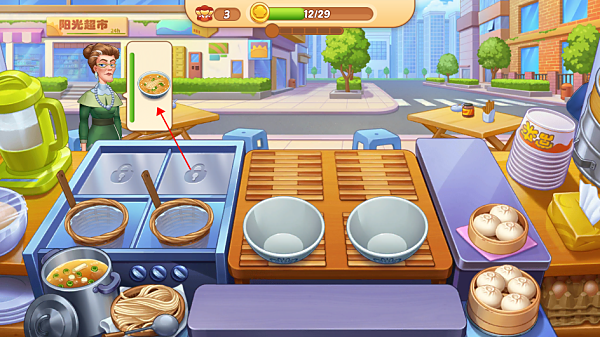 3、烹饪时要随时留意进度条,食物一旦完成,立刻点击将其盛出,然后再点击一下就能端给正在等待的客人。