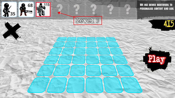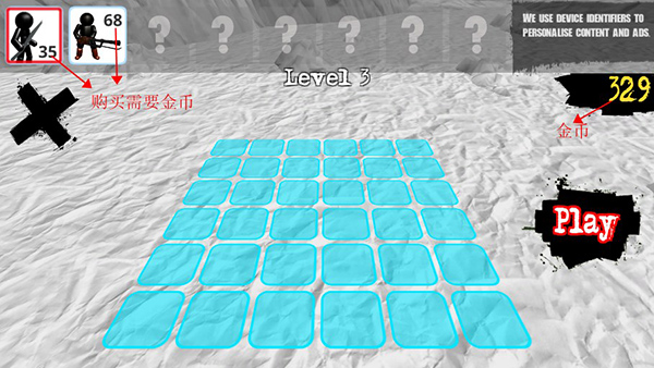 先在上面选好你要买的兵种,然后点下面的蓝色格子,就能把兵放上战场。阵型摆好后点“play”开打。要是觉得摆得不好,直接点左上角的“X”就能全部撤掉重来。