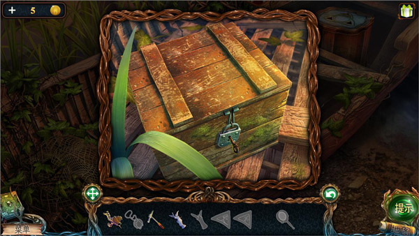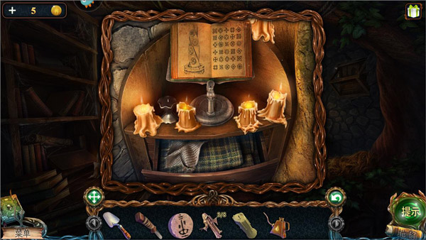 5、小屋内,图中1柜子处获得未点燃的蜡烛,点击阅读蜡烛旁边的书籍得到美人鱼和生命之湖的线索,然后再次点击书籍,提示“这里”有密码;打开柜子抽屉,点击布料获得油壶。