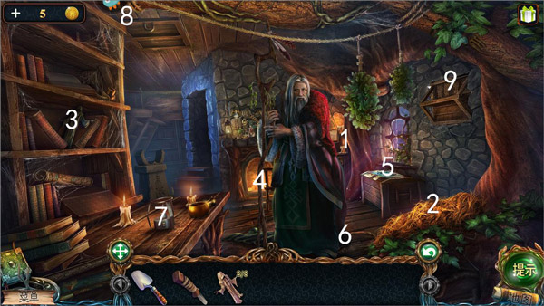 18、农具间内,图中1获得能量球;2处获得大叉,对6处使用大叉获得第六块和尚雕塑;3处点击阅读得到线索哈芬斯,4处得到捕虫网,5处得到第七块和尚雕塑。