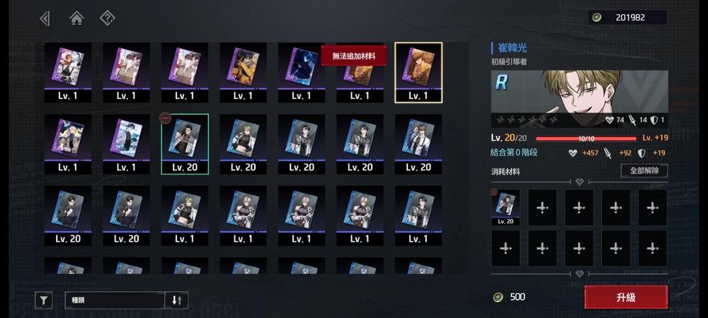 2、把第一张R卡升到满级(20级),然后直接把它当狗粮喂给下一张R卡,就这么一直循环下去。