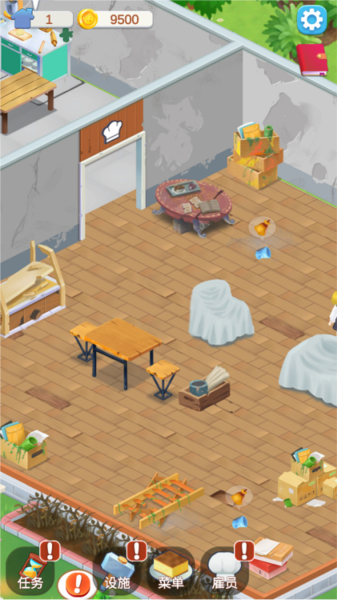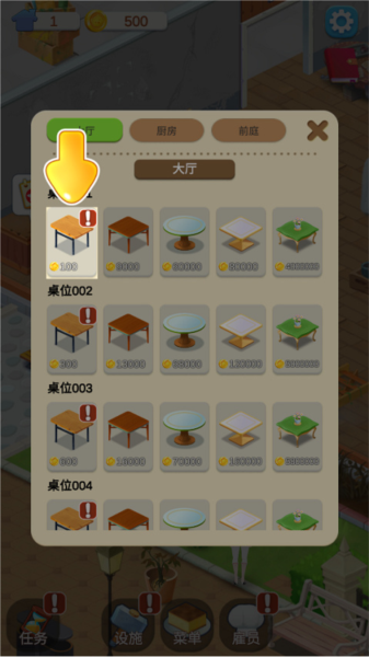 1、刚进游戏,店里空荡荡的,先整个桌椅吧。在界面下方找到并进入「设施」面板,将分类切换到大厅后,便可选择预算内的桌椅样式进行购买。。记住,不同的家具有评分加成,刚开始钱少,先买点基础的凑合用。