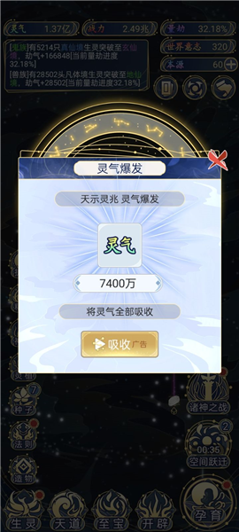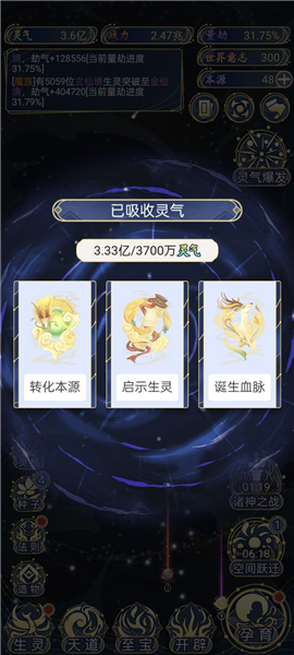 - 关于灵气的获取,主要靠“空间跃进”。你可以这么理解,一个空间里的灵气是有限的,采光了就没了。所以这游戏不适合纯挂机,物资收完、CD一好就赶紧跃迁到下一个地方去。离线挂机的收益更是低得可怜。