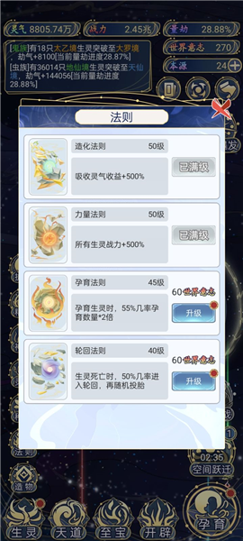每当你的世界提升一个档次,各种功能的等级上限也会跟着提高。我实测下来,建议优先点增加灵气的项目,这样抽卡快,能迅速积累早期战斗力。