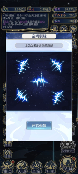 这玩意给的本源收益不高,但好处是不用看广告。不过,本源这东西也能通过改手机时间来刷,比如今天21号,你把时间调到22号,每日领取的本源就刷新了,领完再把时间调回来,又能领一次。懂的都懂。所以现在这个空间裂缝基本就是个小游戏,等灵气和世界物资CD的时候可以点进去玩玩解闷。
