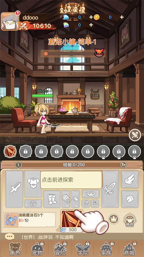 2、然后主界面那个大大的“探索”按钮,点它就开始推图冒险了,非常直接。