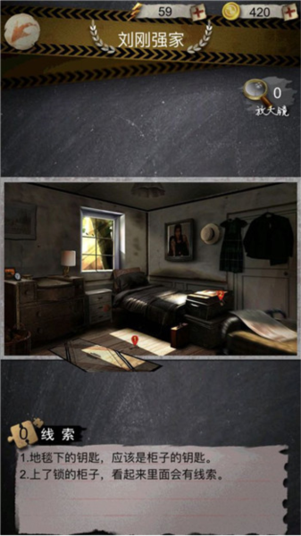 2、到了刘刚强家,主要找两个东西。一个是地毯下面藏着的钥匙,看样子是柜子钥匙;另一个就是那个锁着的柜子,里面肯定有货。