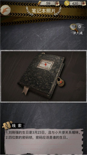 3、接着检查一本笔记本的照片,又能发现两条线索。信息一,刘刚强的生日是3月23号,而且他跟一个小天使关系不清不楚;信息二,有个四位数的密码锁,密码八成是谁的生日。