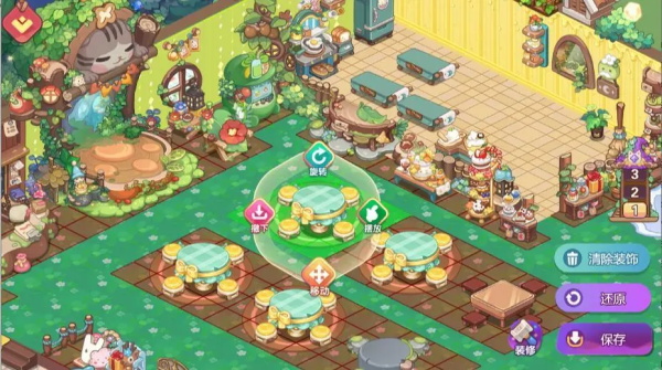 餐厅装修这块自由度还行,桌子、屏风、墙纸啥的都能换。说白了就是个让你肝材料搞装修的坑。从石头桌子到糖果宠物屋,花样挺多,想把餐厅折腾成什么样全看你自己。讲真,UI稍微有点复古,但功能确实没毛病。