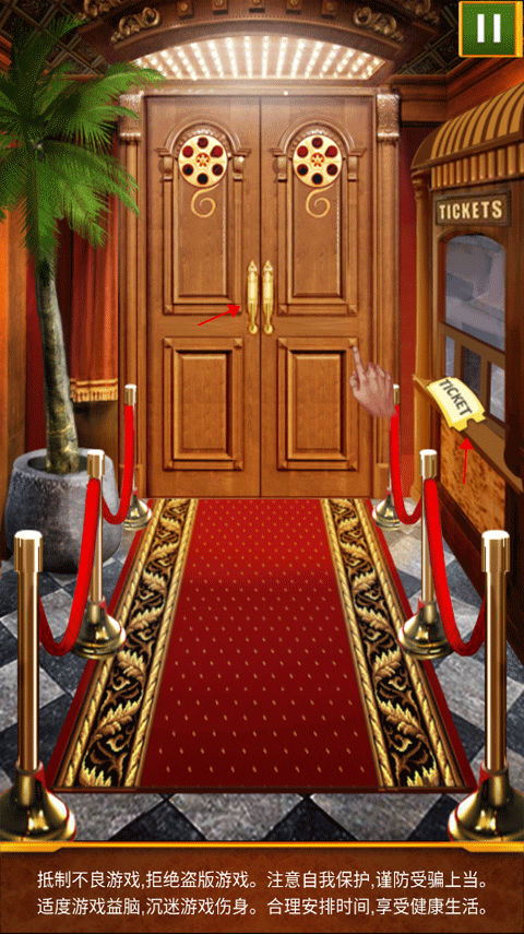 这关也一样,跟着提示走,点右边那个窗户,拿到门票就直接进门。