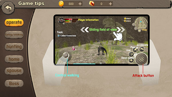 1、进游戏后,划屏幕转视角,左手摇杆走路,这个老玩家应该都知道。左上角是你的血条体力条,右上角是小地图。右手那几个键,大的是普通攻击,旁边几个分别是头槌、吼叫、叼东西和冲刺。大家看下面这张截图,界面布局就长这样。