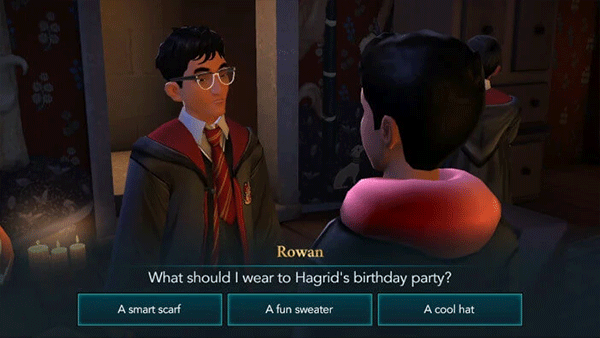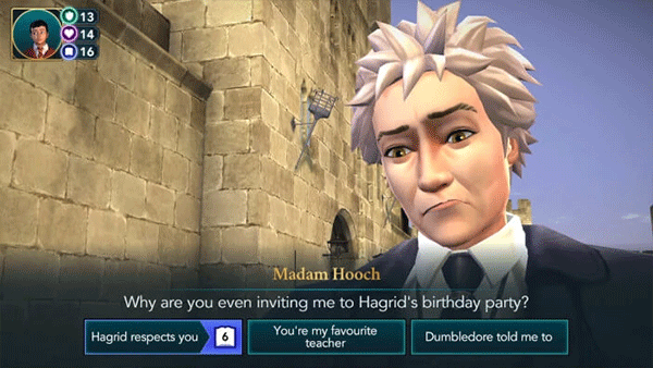 11、下课后,你将和胡奇夫人谈论海格的生日聚会。她会很好奇你为什么要她参加。你可以用三种不同的方式回答。虽然每个选项都会产生相同的结果,但选择第一个选项将获得10个知识点和5个房屋点,因此建议您选择该选项。