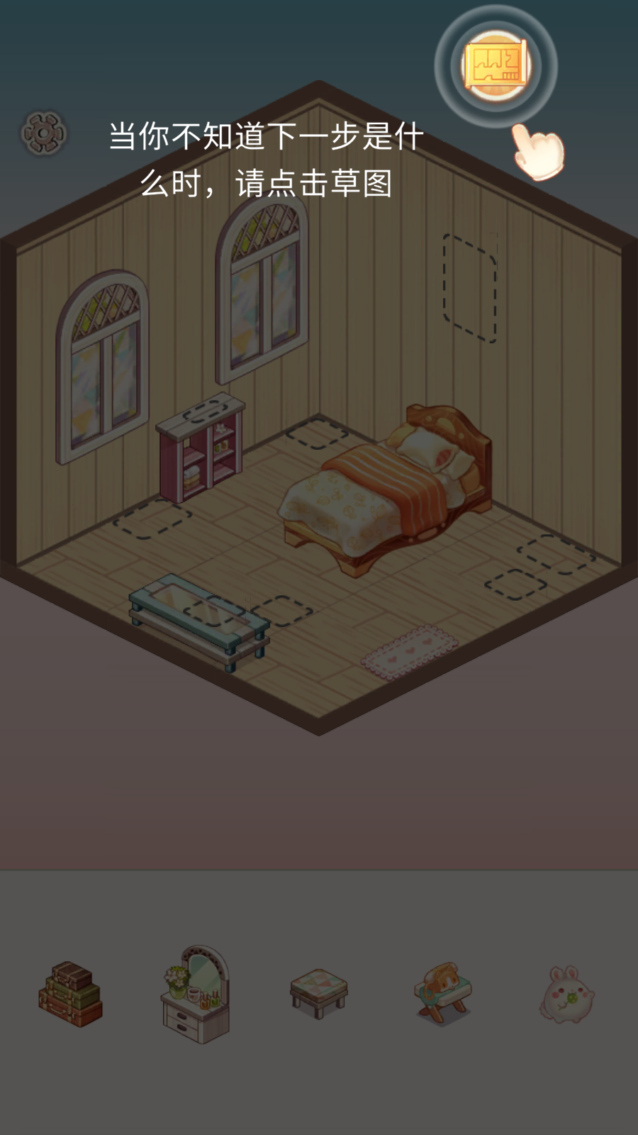 2、要是卡关了,不知道哪个玩意儿该放哪,可以点那个“草图”瞅瞅。那上面有房间最终完成的样子,给你当个参考。
