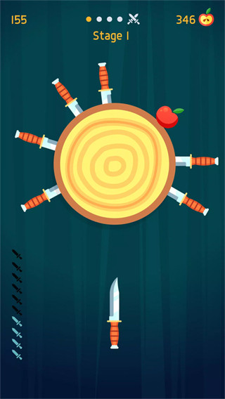 看准合适的时机点击屏幕就能够把飞刀丢出去,需要注意不能碰到刀子和钉子,碰到的话就会结束,在闯关的过程中需要把飞刀丢在苹果上就能够获得更高的分数,还有很多不同难度的关卡,关卡会慢慢变得很难,需要考验好自己的眼力,最后只要把指定的飞刀丢完了就能够获胜。