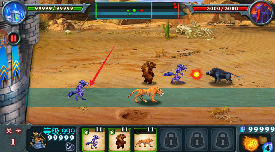 6、把你想用的猛兽卡牌,直接用手拖到战场上,它自己就会找敌人打了。