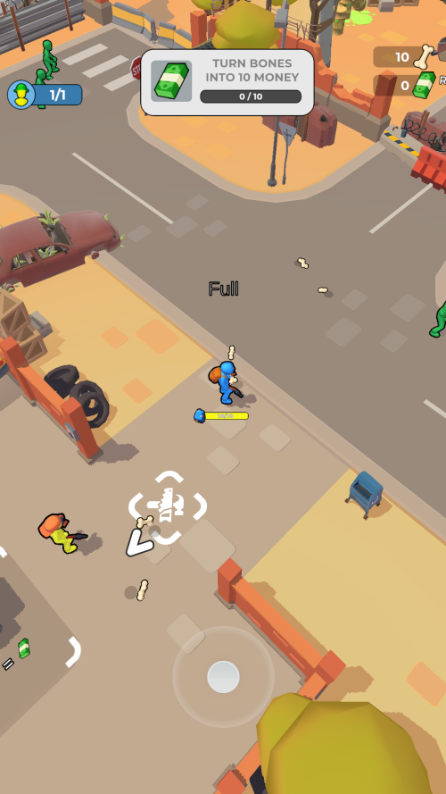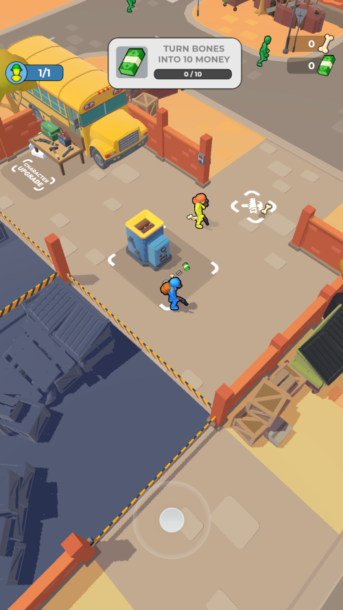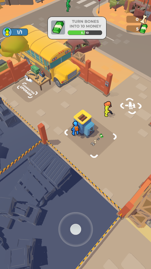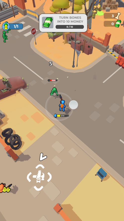 2、操作嘛, 就是左手摇杆搓方向, 上手没难度。你只管走位, 角色靠近敌人会自动开火, 突突到对面血条清空为止。打死的僵尸越多, 掉的骨头就越多, 简单粗暴。