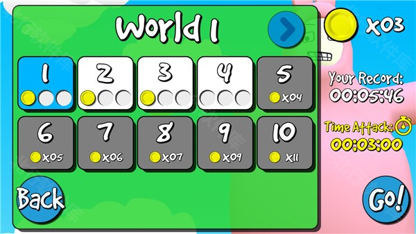 1、核心的闯关模式,目前有30个关卡,分布在3个主题世界里。你可以自己单刷,也能叫上一个倒霉蛋朋友搞双人合作。每关除了过关还有些附加挑战,想完美通关有点难度。