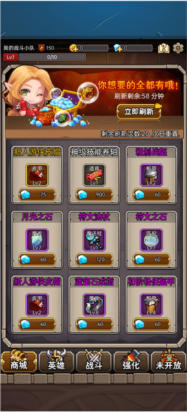 6、游戏里就两种钱:金币和钻石。钻石唯一的来源就是看广告,前期千万别手贱去商店买东西,能攒多少就攒多少,后面有大用处。金币就一个用途,闭着眼睛强化装备就行。大家看下面这张截图,商店里这些花里胡哨的,前期别碰。