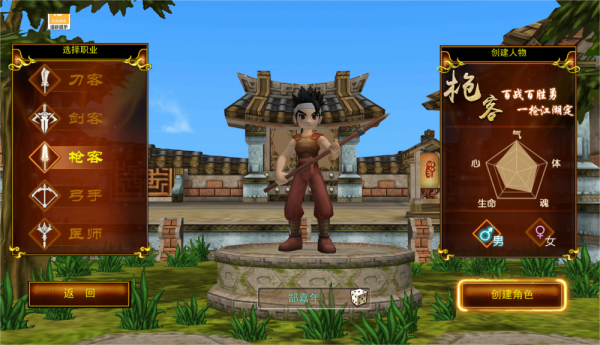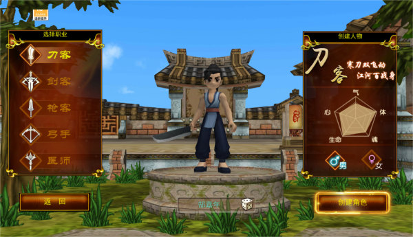 目前能玩的职业有五个,就是【刀客、剑客、枪客、弓手、医师】这几个经典款,每个都有自己的定位。创建角色的时候就能选,别选错了,后期转职我还没研究。