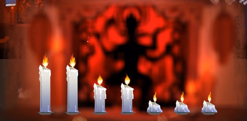 7、留意窗户上的蜡烛图案,根据这个提示去解开神像那里的蜡烛谜题,能拿到半截蜡烛。搞定后继续往右走,切换场景。