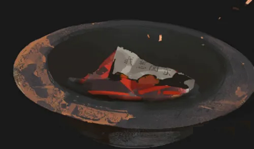 12、最后一步,把前面拿到的那些道具全扔火盆里烧了,再爬上棺材,剧情就推到头了。火盆里还有张纸条,看完就差不多是结局了。