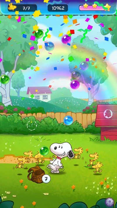 玩过泡泡龙的兄弟对这套路肯定不陌生。你控制史努比发射手里的泡泡,游戏里有辅助线帮你瞄准,只要射出去的泡泡跟上面同色的连在一起,凑够三个或以上就能消除。小鸟就困在这些泡泡里,消掉泡泡就算救出来了。不过每关都有步数限制,想拿高分上排行榜,就得用最少的步数完成任务,这个得自己多琢磨琢磨。