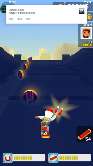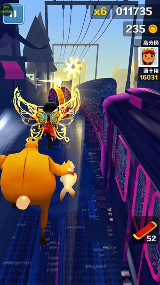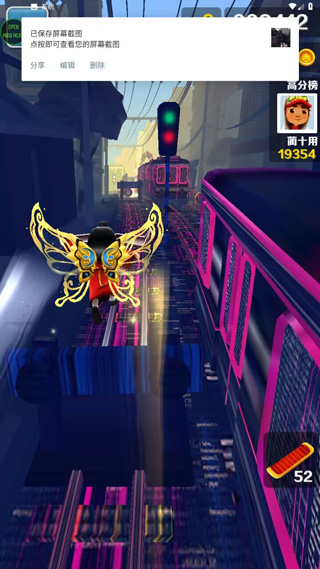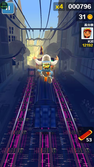 这个乱码之城版本跟原版比,确实玩出了点新意思。底子没变,但整个画风都魔幻起来了,地图看着特带劲,感觉跟玩了个新游戏似的。这种花里胡哨的色调反而没那么紧张了,就算一头撞墙上心态也不会崩。通过火车和各种道具的设置,让玩家能在三个层面上移动。地面层就不说了,跟其他跑酷游戏一样;火车顶层,可以从打开的车厢跳上去跑;天上那一层得靠道具,能让你直接起飞,在天上狂奔。感觉滑动操作的响应做得不错,延迟很低,指哪打哪,体验没毛病。
