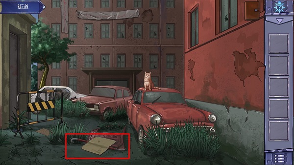 5、到了街上,注意看地上,图里标出来的这个位置有张纸和一根撬棍,都捡起来。然后顺着箭头的方向,往那栋大楼走。
