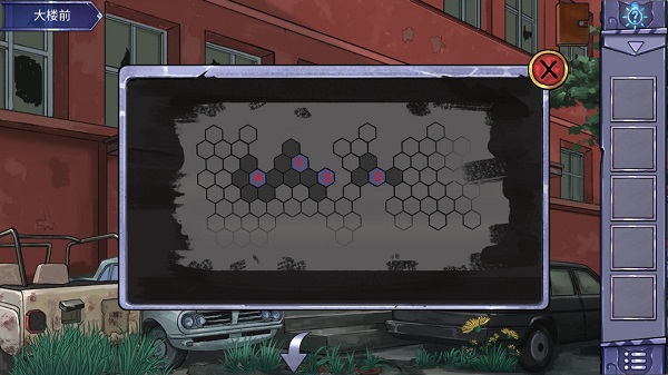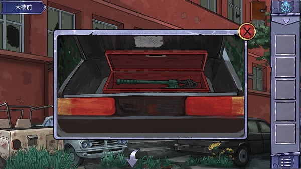 6、走到大楼跟前,用刚才捡到的撬棍把那辆破车的后备箱撬开。车厢里有张贴纸,注意看上面数字的顺序,再看看它们相邻的边有几条,就能推出密码是4325。然后去看车厢里那个密码箱。