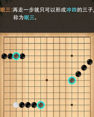 再走一步只能形成“冲四”的三个子,这叫“眠三”,威胁性就小多了。