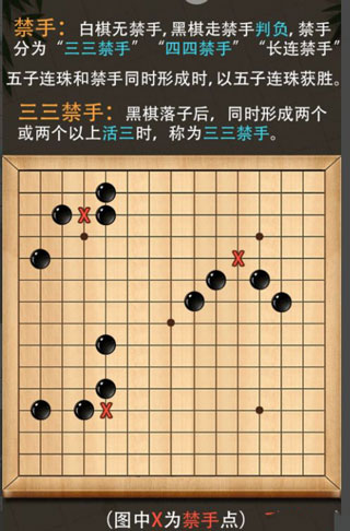 规则上,白棋没啥限制,随便下。但黑棋有“禁手”的规矩,一旦走出禁手棋直接判负。禁手分三种:三三禁手、四四禁手和长连禁手。啥叫三三禁手?就是黑棋落下一个子之后,同时形成了两个或两个以上的“活三”。看到截图里这个界面没,就是这个意思。