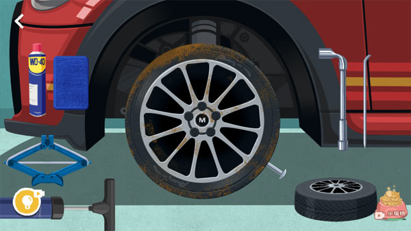 2、进去之后一地工具,围着个轮胎。别瞎点,得按顺序一步步来才能把轮胎给换了。