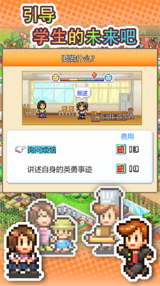 口袋学院物语3是一款让人扮演校长来经营学校的模拟游戏,一开始学校很小、建筑也少,要靠招募学生收学费来慢慢解锁新建筑,老师和学生的数量也会跟着一起增加,土地有限所以建筑要好好规划,摆得合理不只看起来整齐,管理起来也顺手很多,每个阶段都有不同的剧情和挑战在等着,还可以认识各种NPC跟他们互动,目标就是把这所小学校一步步发展成全区最厉害的学校。