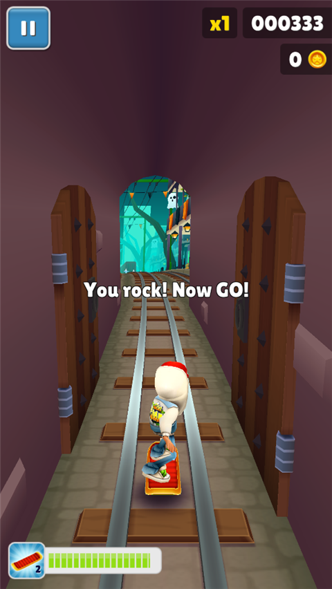 5、快速双击屏幕,就能踩上滑板,这玩意儿能持续飞一会儿。没滑板的时候,撞到任何东西都会被警察抓住,游戏直接结束。但如果你脚下有滑板,它就相当于一条命,撞了之后滑板会碎掉,但你人没事,还能接着跑。