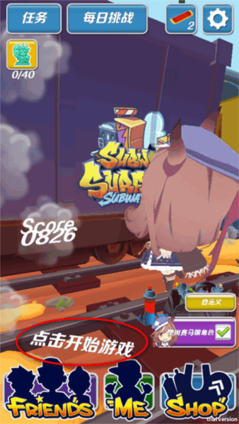 1、游戏打开,看到主界面没?点一下屏幕中间那个大大的开始按钮,直接开跑。