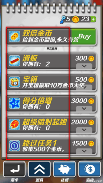 2、商店买得分倍增:如果你金币多得花不完,可以去商店花3000金币买个“得分倍增”,效果跟捡到的一样。