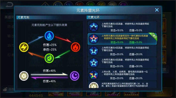 2、进阶一点的玩法,就是看英雄的元素属性。凑齐同元素的能激活光环,全队加buff,这玩意儿提升巨大。至于具体哪个光环牛逼,你们自己去翻翻别的攻略,这里就不多废话了。