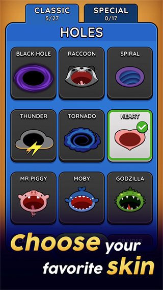 2、多样化的黑洞皮肤,可透过闯关所获得金币或关看不同的关看来解锁或购买;
