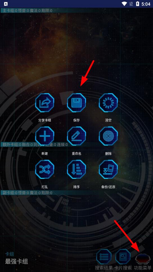 9.卡组编辑完之后,别忘了再点一次【功能菜单】,然后选【保存】,不然你刚才就白忙活了。