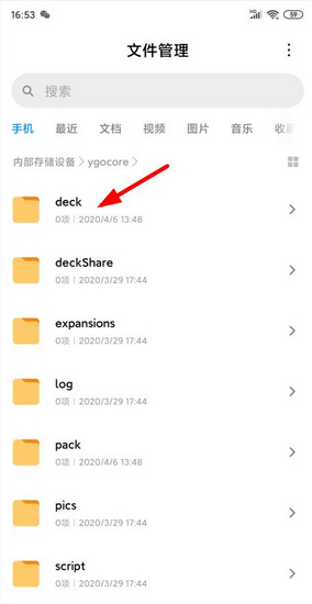 2.然后你得在手机文件管理器里找到一个叫【ygocore】的文件夹。