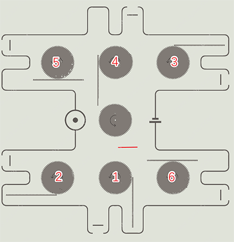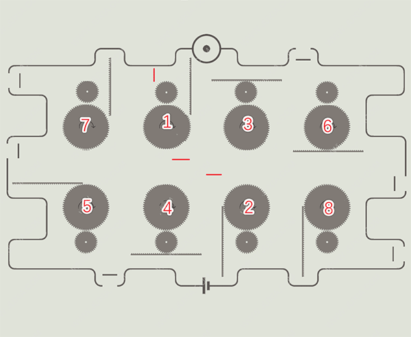 后面这关更变态,是个多段操作。看图,先快点1、2,等齿条到红线位置,马上连点3、4、5,然后盯住【齿轮3】的齿条,它一到红线,立马收尾点6、7、8。一气呵成,懂?
