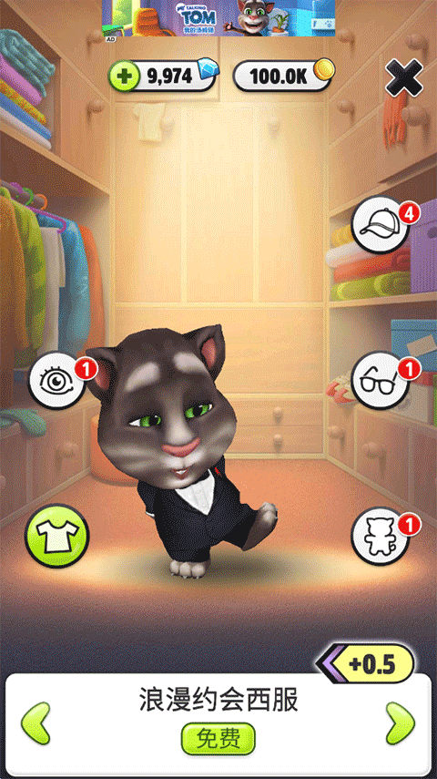 4、等你买下某件衣服后,就会出现一个“选择”按钮,点了之后汤姆猫就穿上了。要是觉得不好看,随时可以点“移除”,让他脱下来。