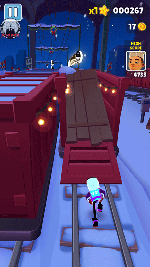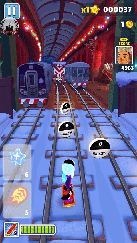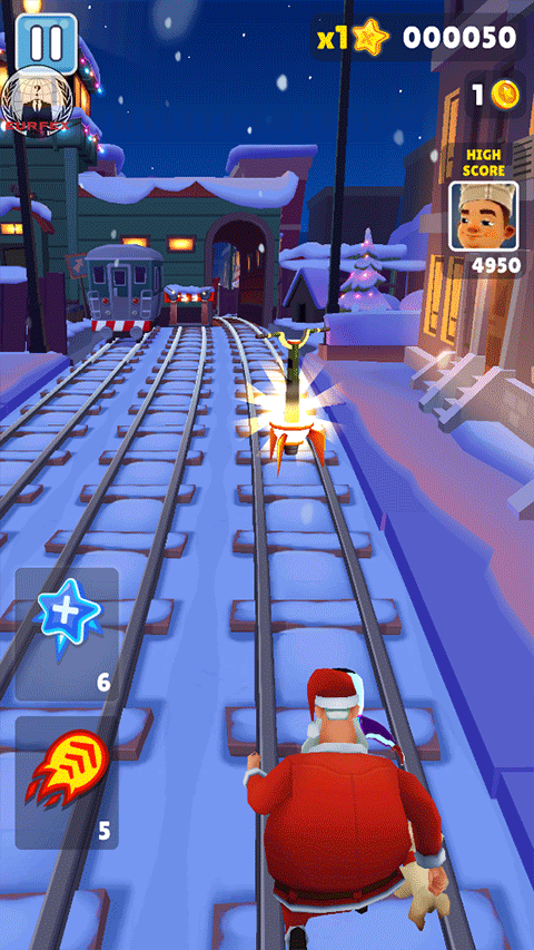 气垫滑板:双击屏幕就能激活滑板,这玩意儿是真·神器。没开滑板的时候,角色撞到障碍物或者火车上,游戏就直接结束了。但在滑板状态下,就等于给角色买了份保险,撞到东西只会消耗掉滑板,人没事,游戏还能继续。滑板消失后有几秒的冷却,等它不闪了又能双击再开,没有使用次数限制。