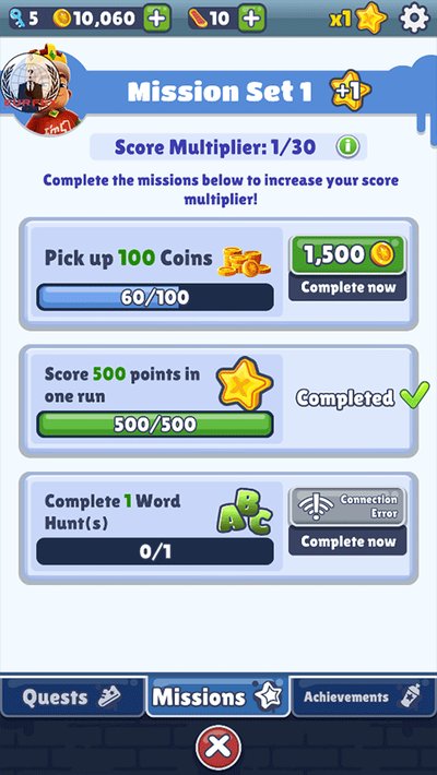 除了跑酷和捡金币,地铁跑酷里还有一套任务系统,让你不至于玩得太无聊。每天只要把每日挑战做了,就能拿到不少好东西。游戏里的任务有好几种,我带你们一个个看。