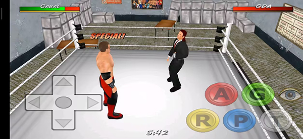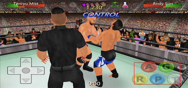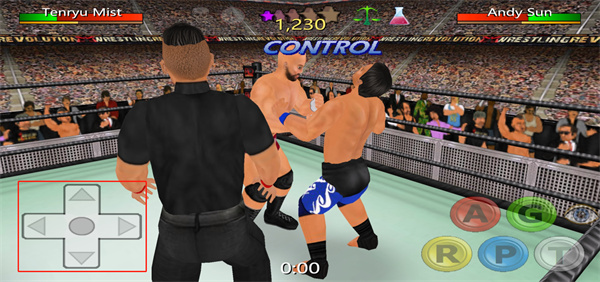 《摔跤革命3D》里的动作基本都是现实里能复刻的,同步率高得离谱。而且这游戏不讲武德,选手还能抄家伙,甚至打急眼了还能把战场延伸到擂台下面。操作这块儿吧,确实有点复杂。屏幕左边是摇杆管移动,右边一堆按键全是攻击相关的,每个键对应不同招式,高手还能搓出各种组合键。刚上手可能会有点手忙脚乱,习惯了就好。