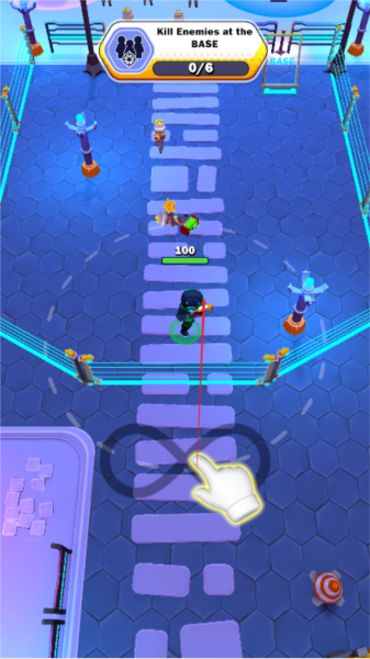 屏幕上划拉一下,控制你的人往前走,别傻站着当靶子。