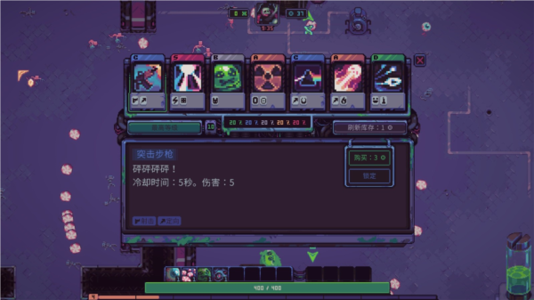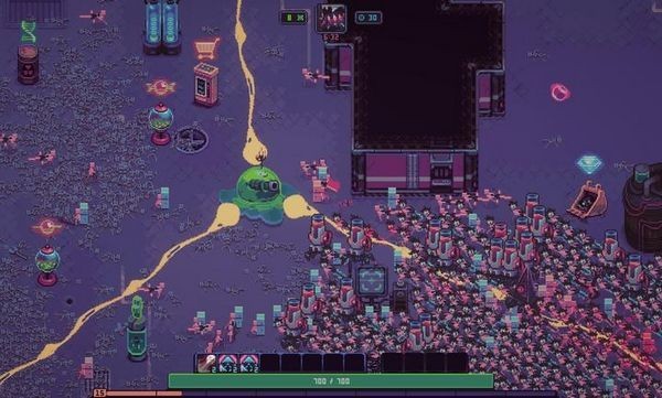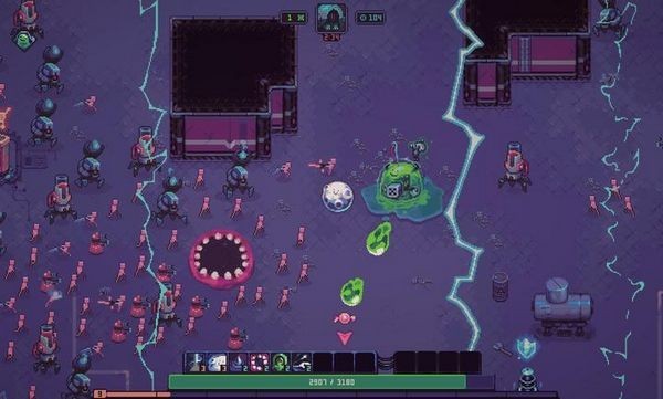 核心就是卡牌构筑系统,你能解锁一堆卡,升级它们,然后组合出各种骚操作,什么激光、喷酸水、炸西瓜,花样多得很。战斗不是无脑站撸,得随时调整打法,资源分配也得动动脑子,因为怪会越来越猛,有点即时战略那意思。老规矩,肉鸽嘛,图是随机的。挂了就重来,但能解锁些永久升级项,让你下次开局能强一点,不至于从零开始。